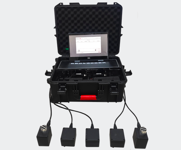 系統(tǒng)由筆記本或平板電腦、軟件、數據處理部件、震動探測器、數據線纜、便攜箱等構成,通過采集車輛震動數據與特定模型進行比對計算,從而判斷車輛上是否有人員藏匿。